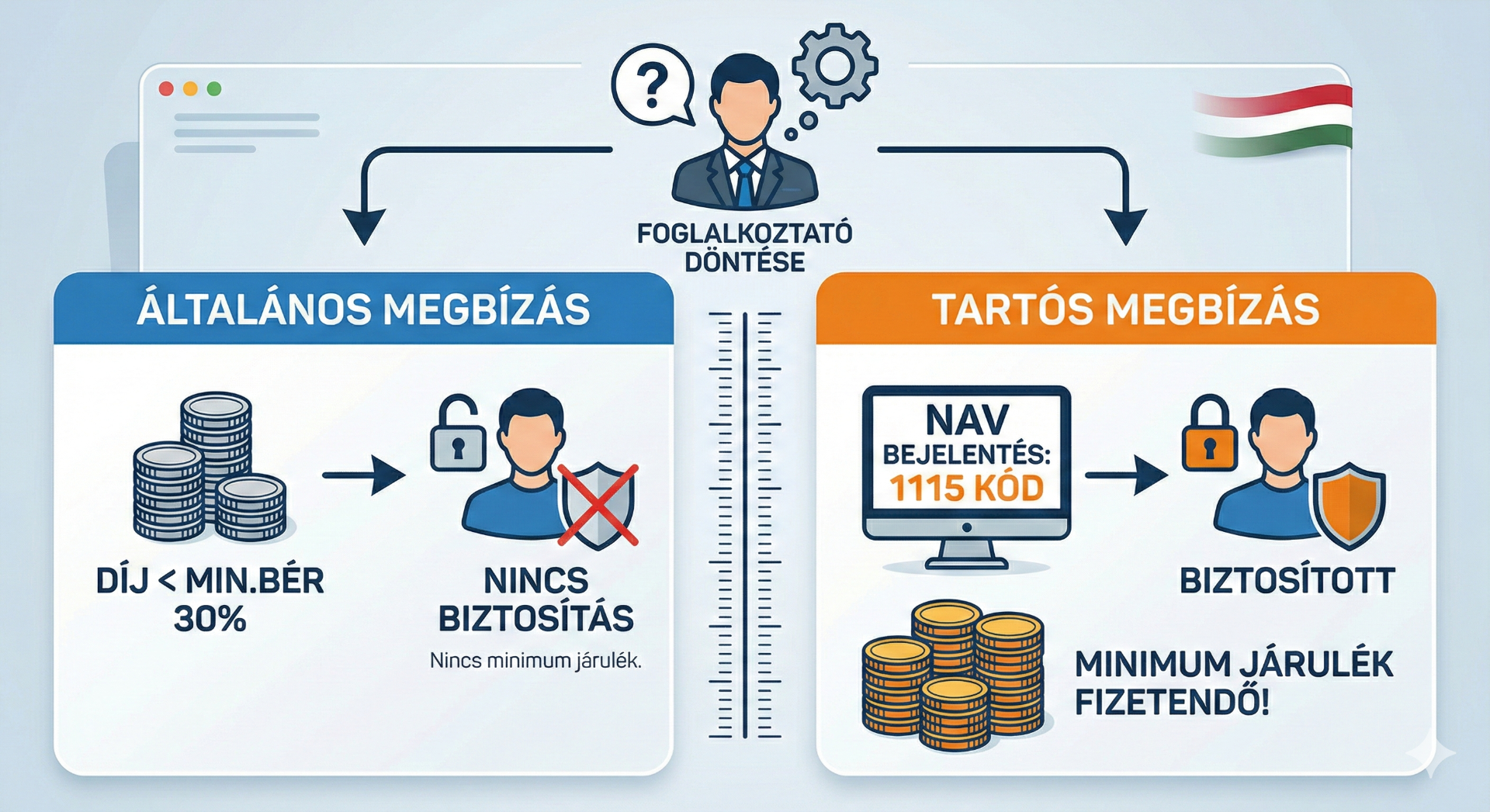 Sok foglalkoztató fejében él az a tévhit, hogy ha egy megbízási szerződés hónapokon át fennáll, azt automatikusan tartós megbízásként kell kezelni a NAV felé. A valóság azonban ennél árnyaltabb, és a döntésnek komoly anyagi vonzatai lehetnek a járulékfizetés szempontjából.